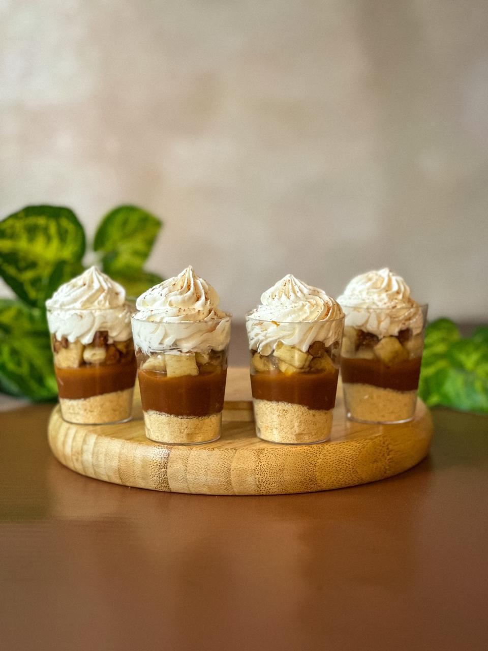 Copinho acrílico base de biscoito, doce de leite, banana, nozes crocante e chantilly finalizado com canela em pó.