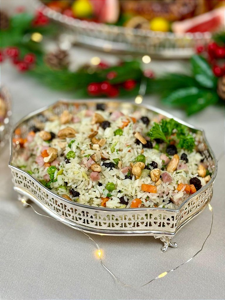 • Prato clássico da ceia de Natal. Nosso arroz à Grega é preparado com cenoura, presunto, alho-poró, uvas-passas e ervilhas frescas. Refogado na manteiga, finalizado com salsa e castanha-de-caju. Aprox (500g)