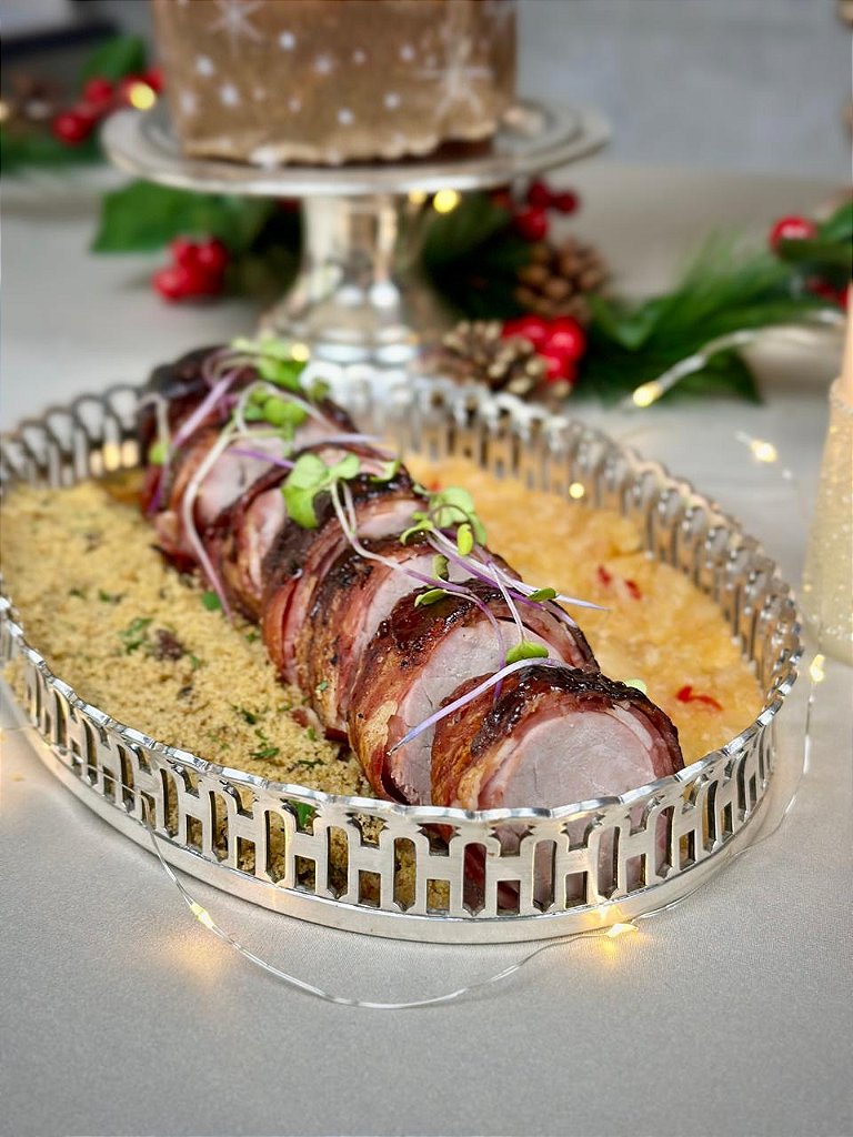 • Filé suíno envolto em lâminas de bacon, assado e finalizado com barbecue caseiro. Acompanha farofa da casa e chutney artesanal de abacaxi com pimenta. Aprox (1,5kg)