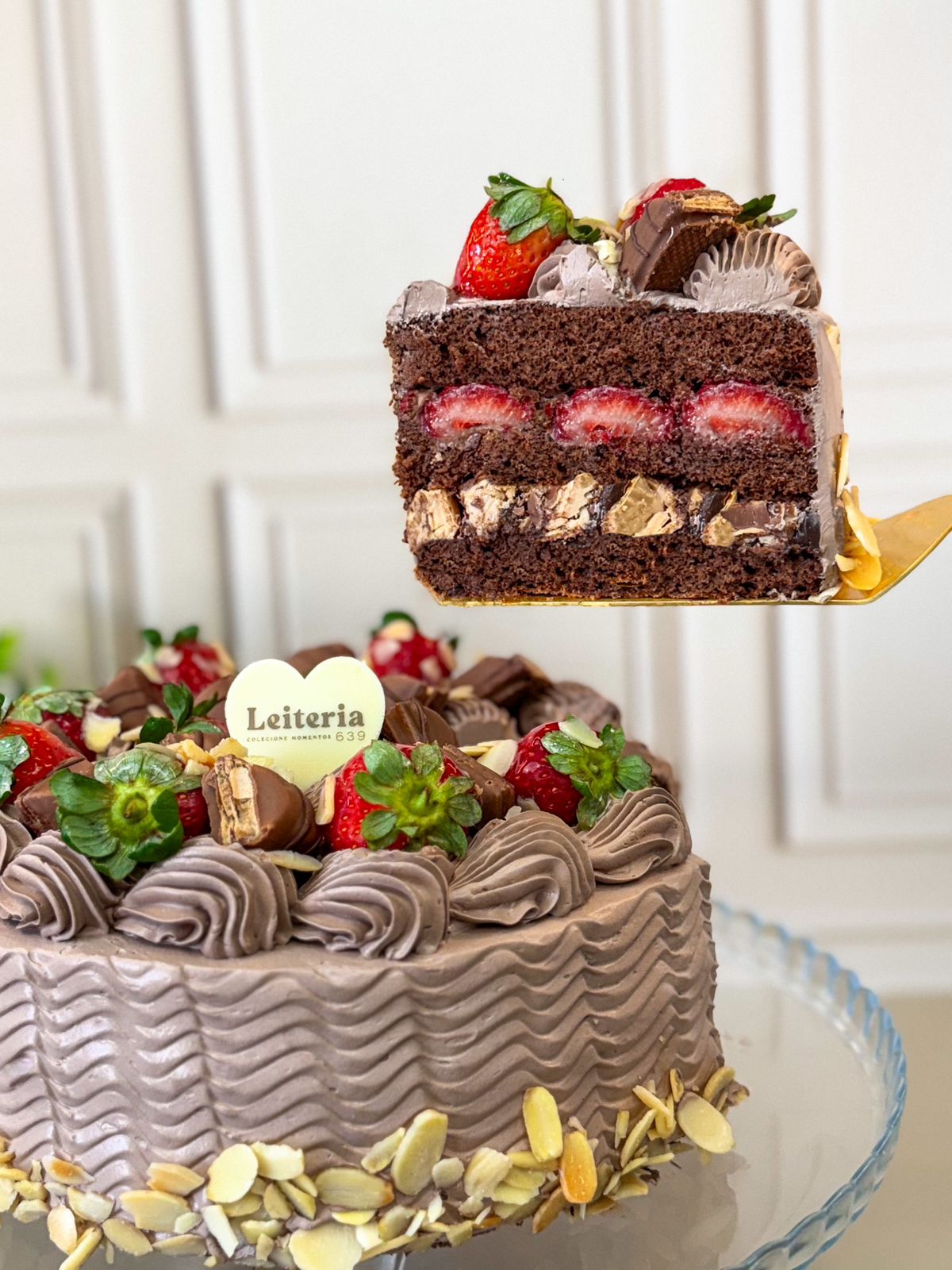 Pão de ló de chocolate, recheio de brigadeiro com morangos picados, nata batida de chocolate com Kinder Bueno, finalizado com american topping de chocolate, amêndoas laminadas e morangos com Kinder Bueno.