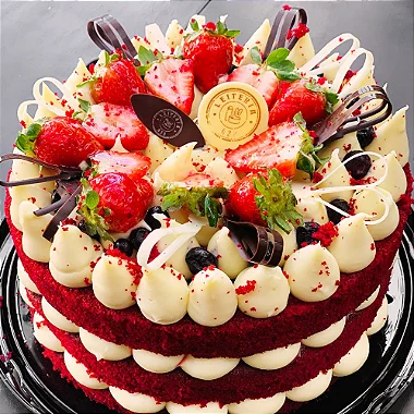 Massa exclusiva de Red Velvet, recheado com 4 Leites (Leite condensado, creme de leite, leite ninho e leite integral). Finalizado com chantilly, frutas vermelhas e arabescos da Leiteria.