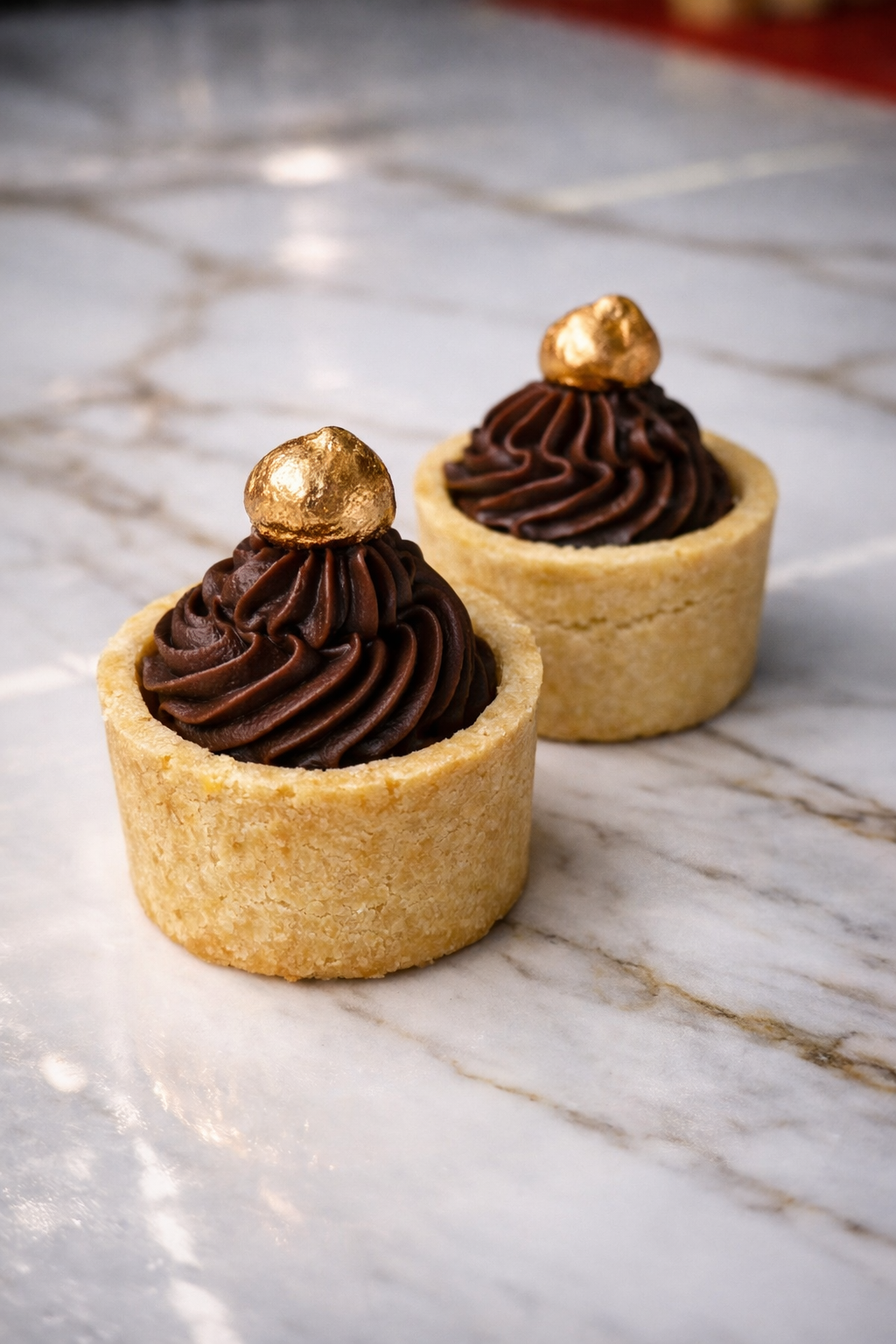 Tartelette crocante com ganache de chocolate ao leite, finalizada com uma avelã dourada.