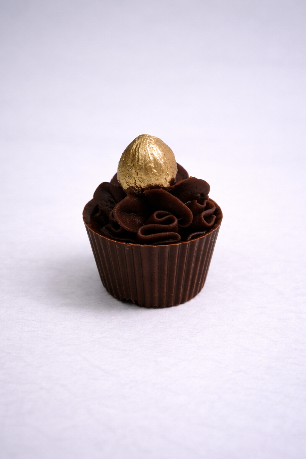 Copinho em chocolate nobre, ganache de chocolate ao leite com licor de avelã, finalizado com Avelã dourada.