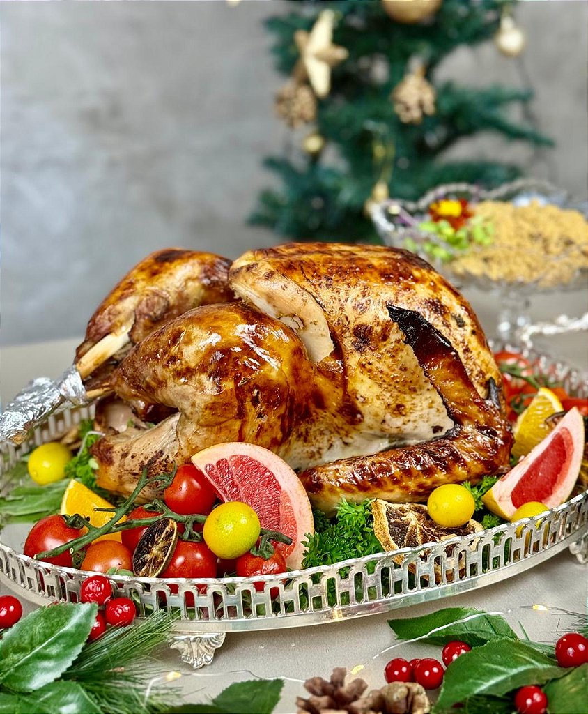 • Marinado com ervas frescas especiais e suco de laranja, assado lentamente para manter sua suculência e aroma. Esta nova versão traz um estilo tropical, sem perder o toque tradicional da leiteria, decorado com ervas, frutas tropicais frescas e desidratadas. Acompanha farofa da casa. Aprox (4,5kg)